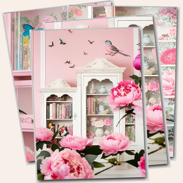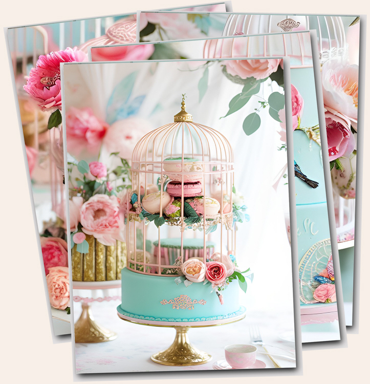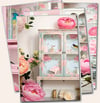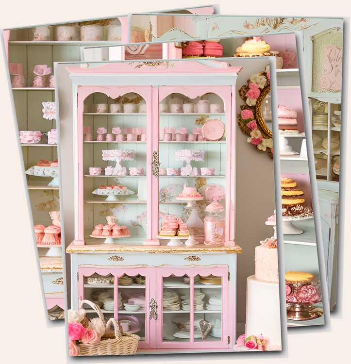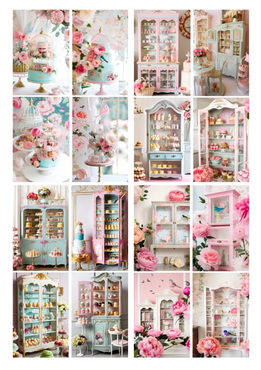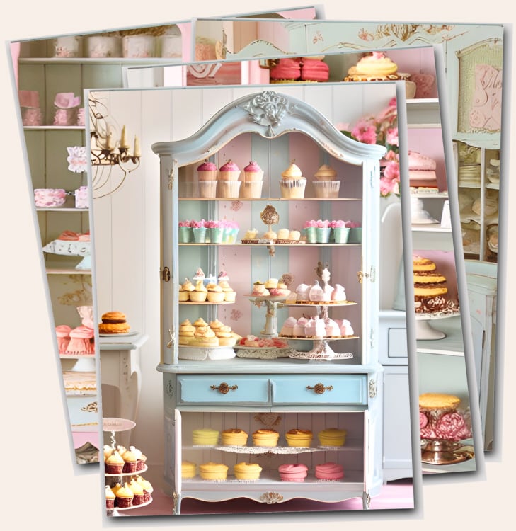 A delicious French patisserie digital downloads collection of cakes, shabby cabinets filled with yummy watercolor cupcakes, birdcages & roses printable papers.