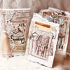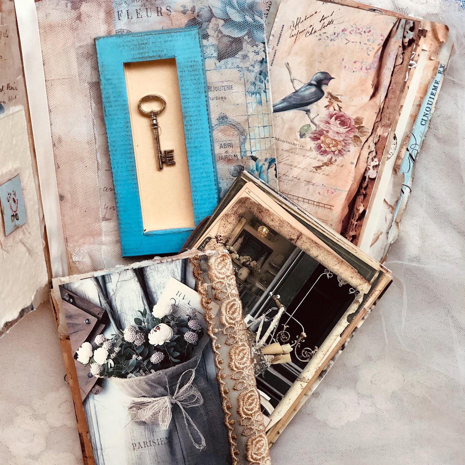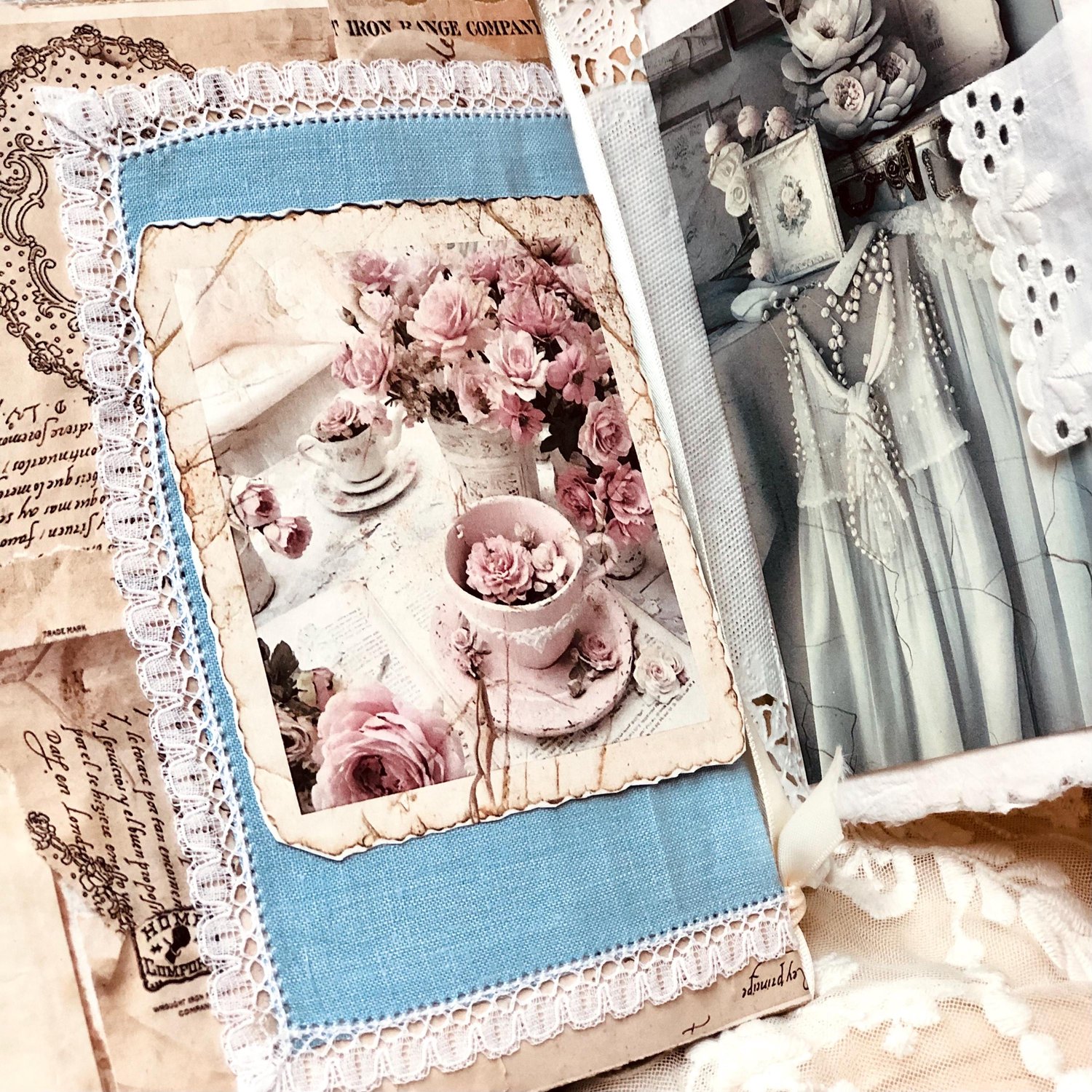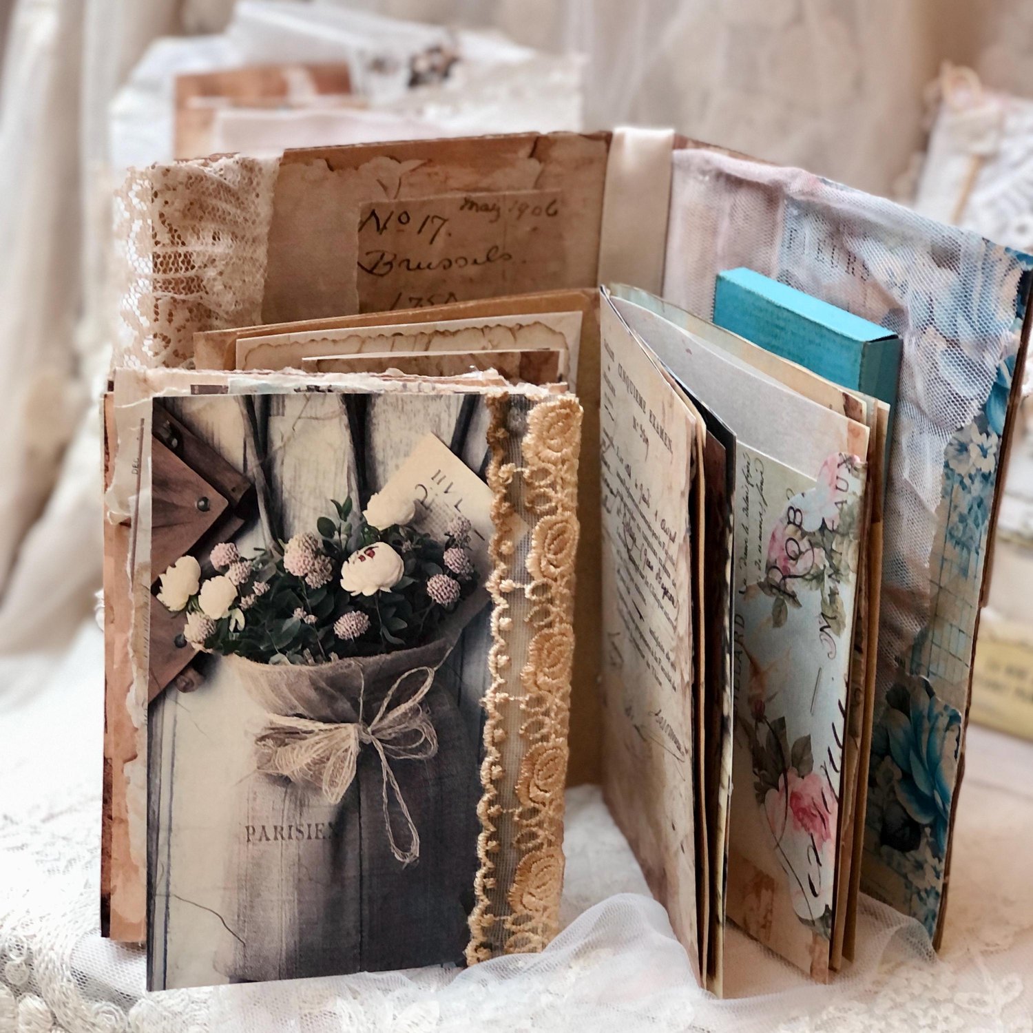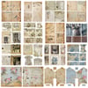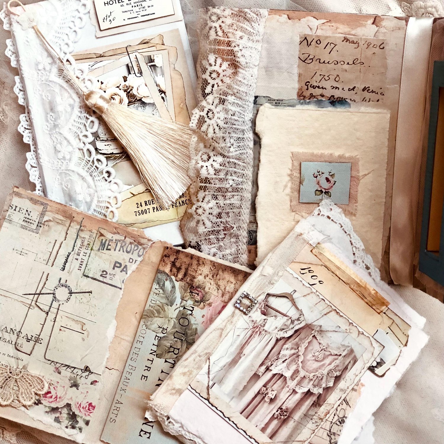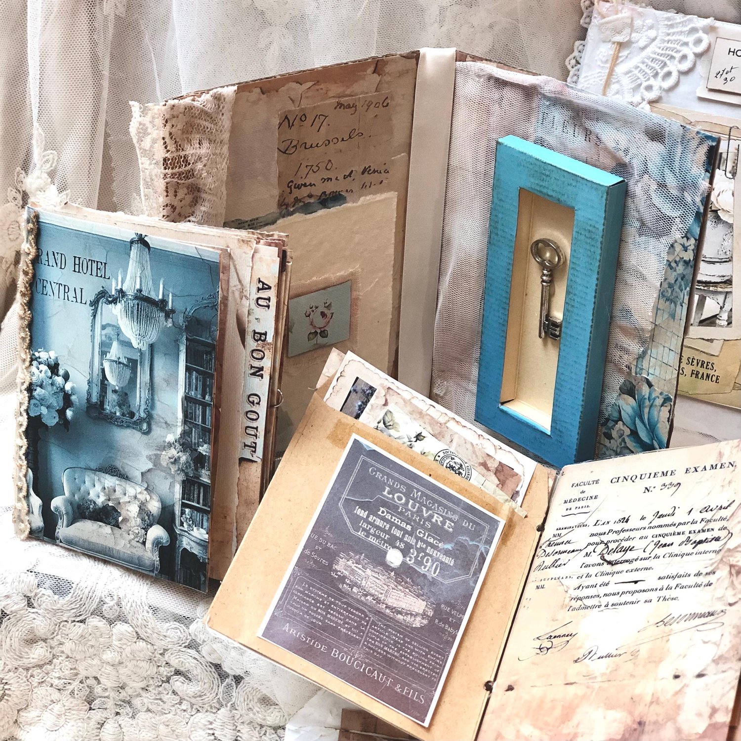 Printable junk journal pages with beige and blue-toned pages, featuring old-style book papers, roses, ephemera pieces, and vintage images.