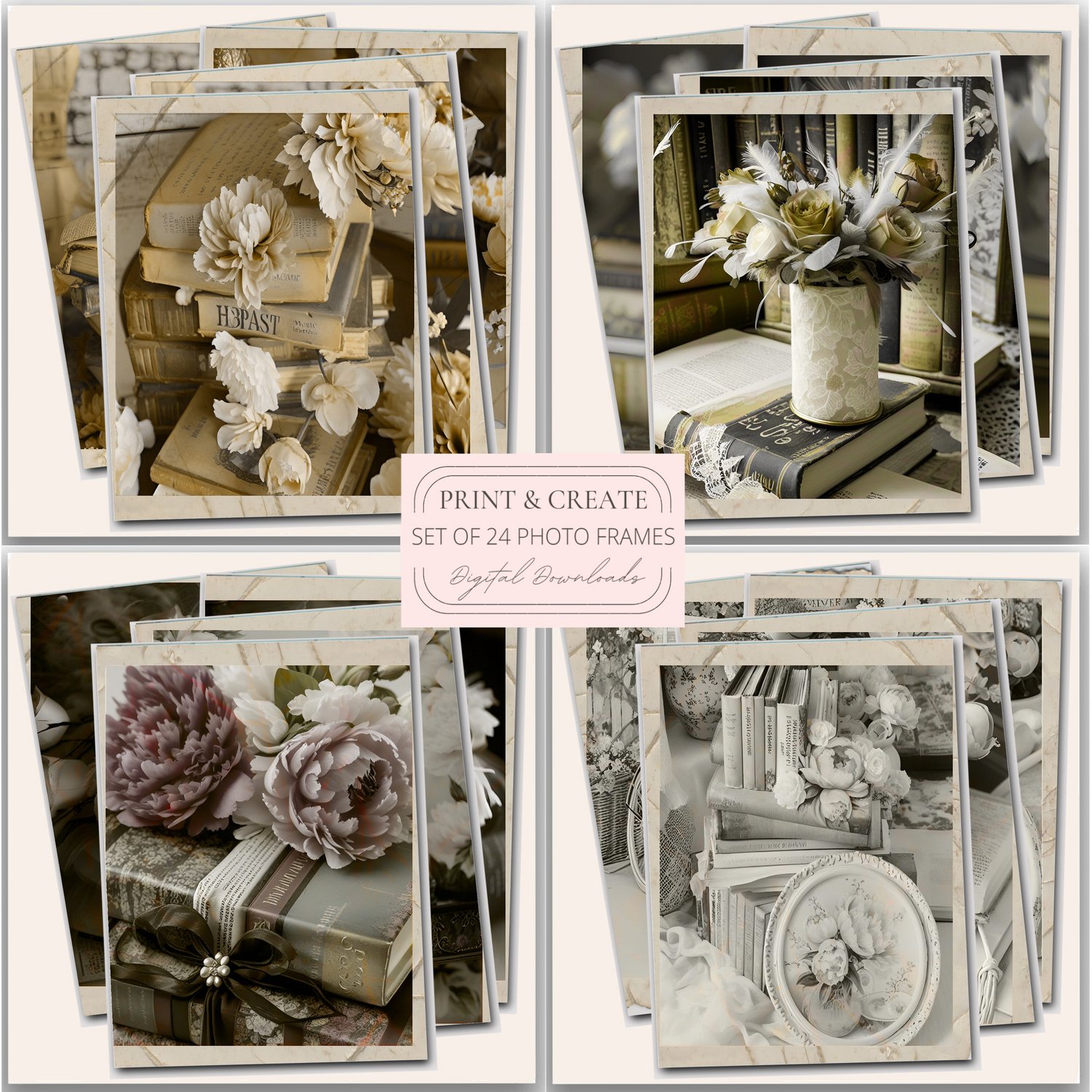 You will receive from each set: 4 files with 6 designs on each page (24 frames) / so total of 48 individual photographs printable images as shown in the video.