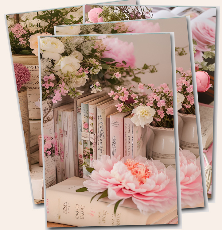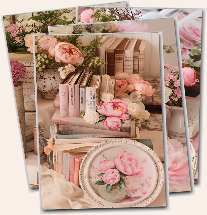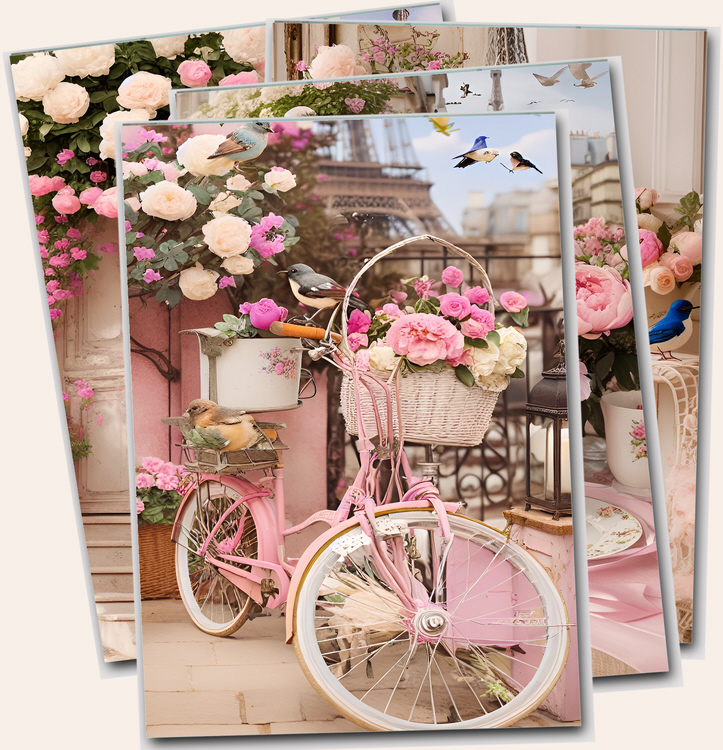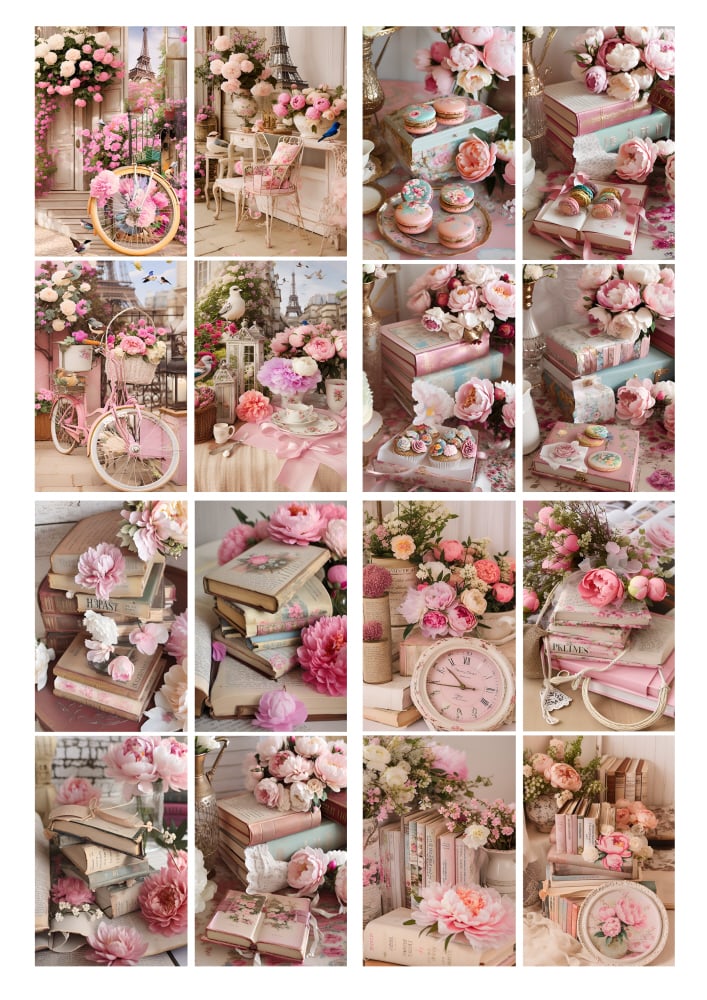 Watercolor collection of digital art prints featuring The Eiffel tower, Paris, peonies, books, pink bicycles and French Macaroons printable files.