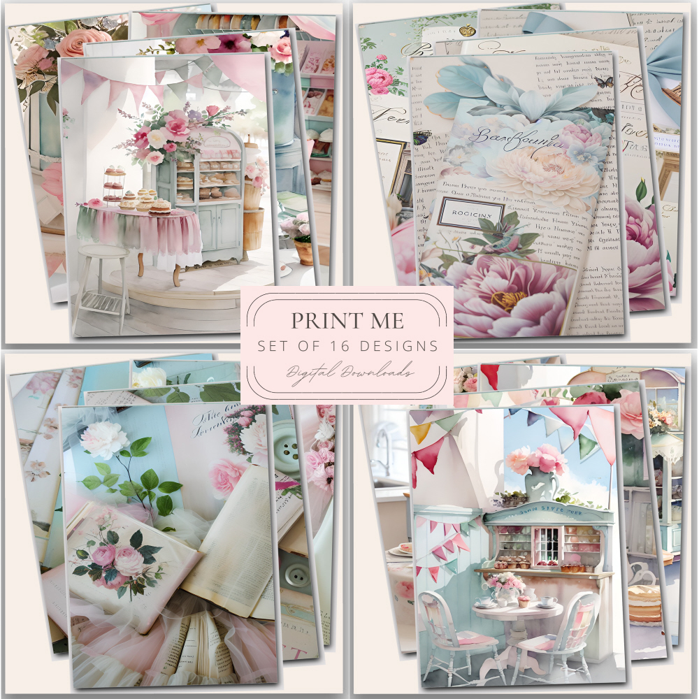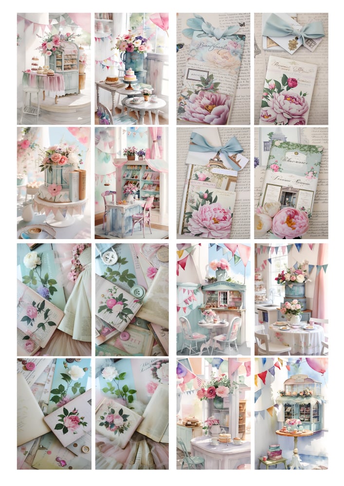 Junk journal digital downloads collection of shabby style watercolor French cafés and collage printable files.