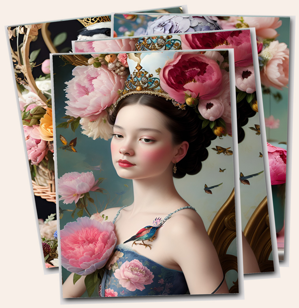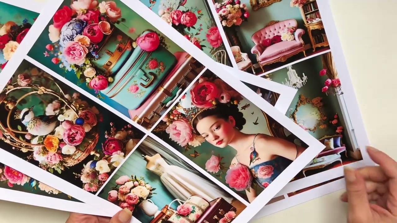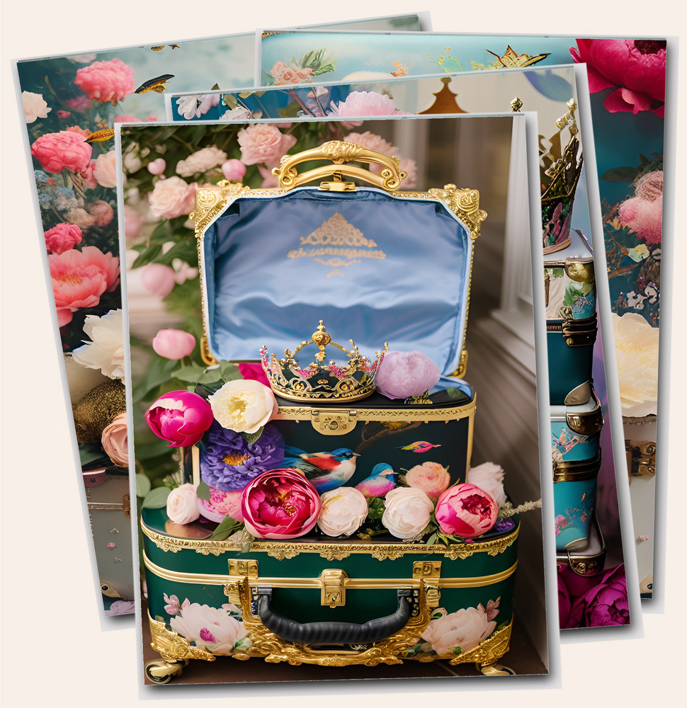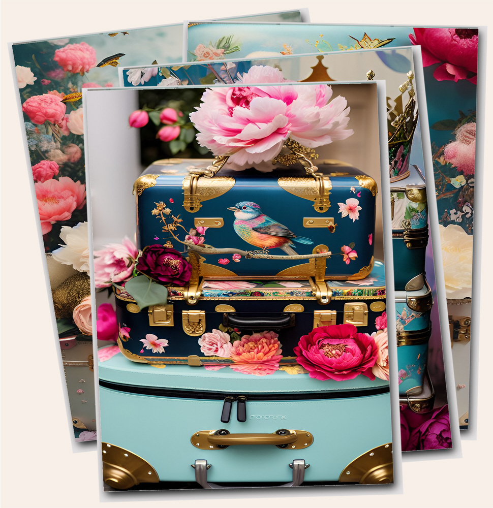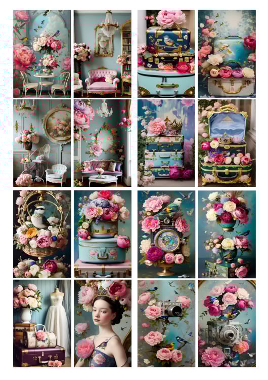 Rococo style with a twist printable digital downloads images featuring luxury suitcases, bedrooms, birds, peonies, old cameras, sofas & chandeliers. Will enhance your junk journals, book covers and can also go inside small picture frames.