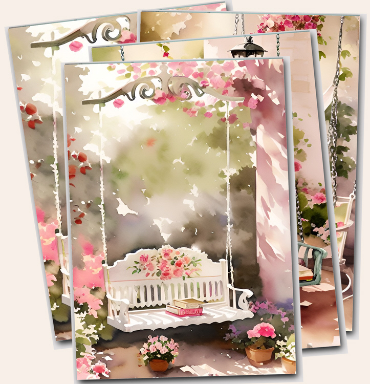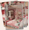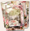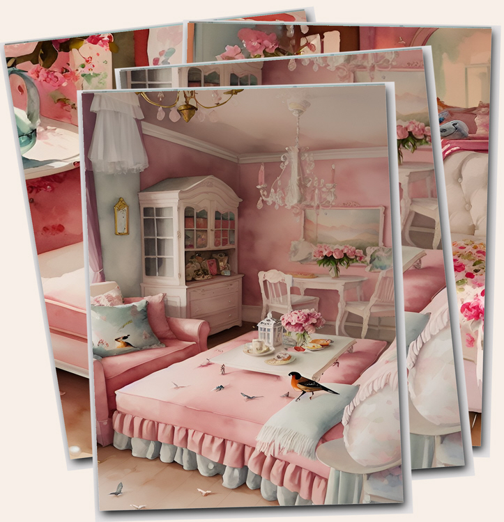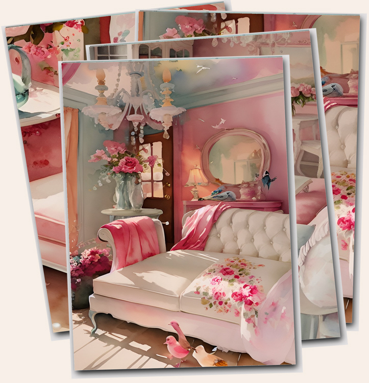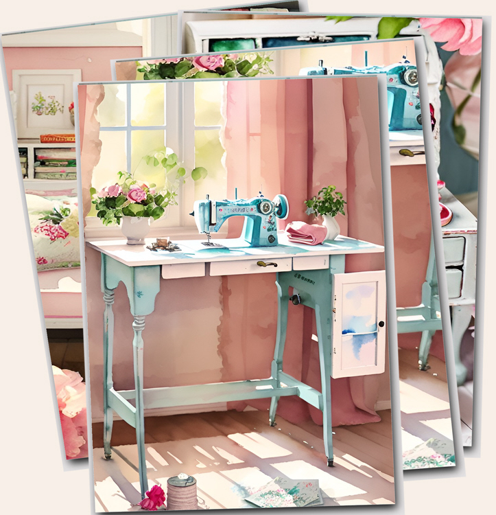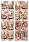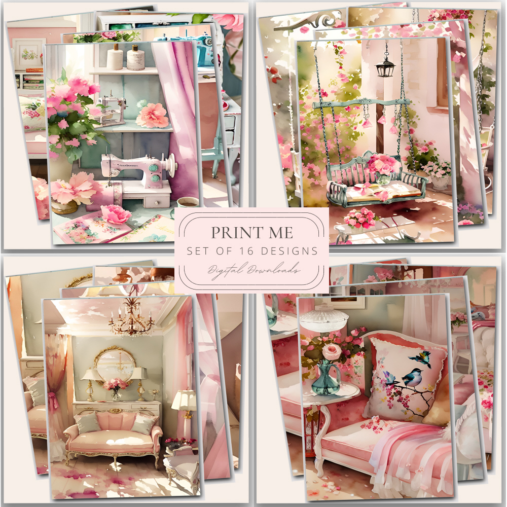 Vintage Chic collection digital prints of craft rooms, sewing machines, living rooms. This pack of files also featuring cottage gardens, pink bedrooms, interiors and shabby sofas printable papers.