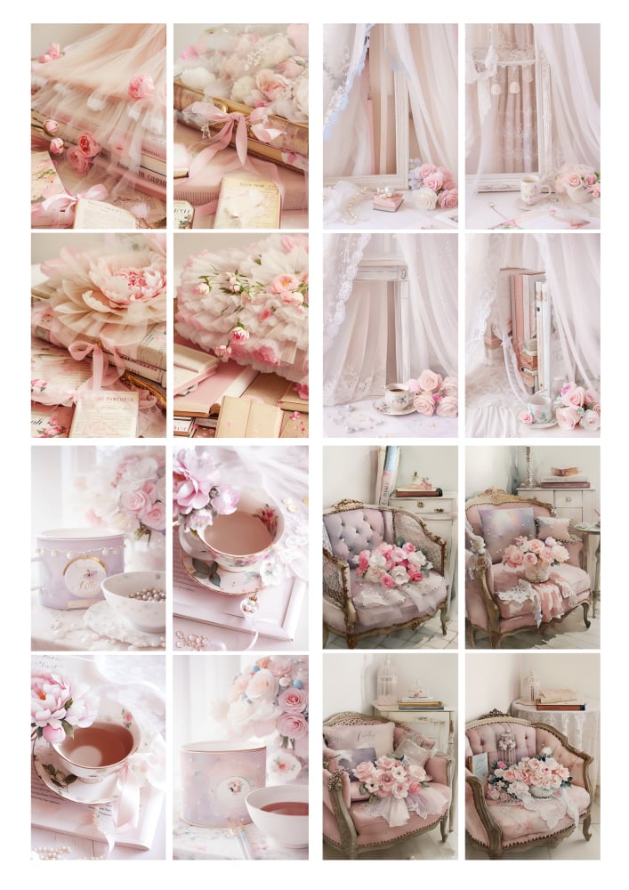 Pinks, whites and creams collection of papers featuring peonies, vintage sofas, tulle and books digital downloads printable files.