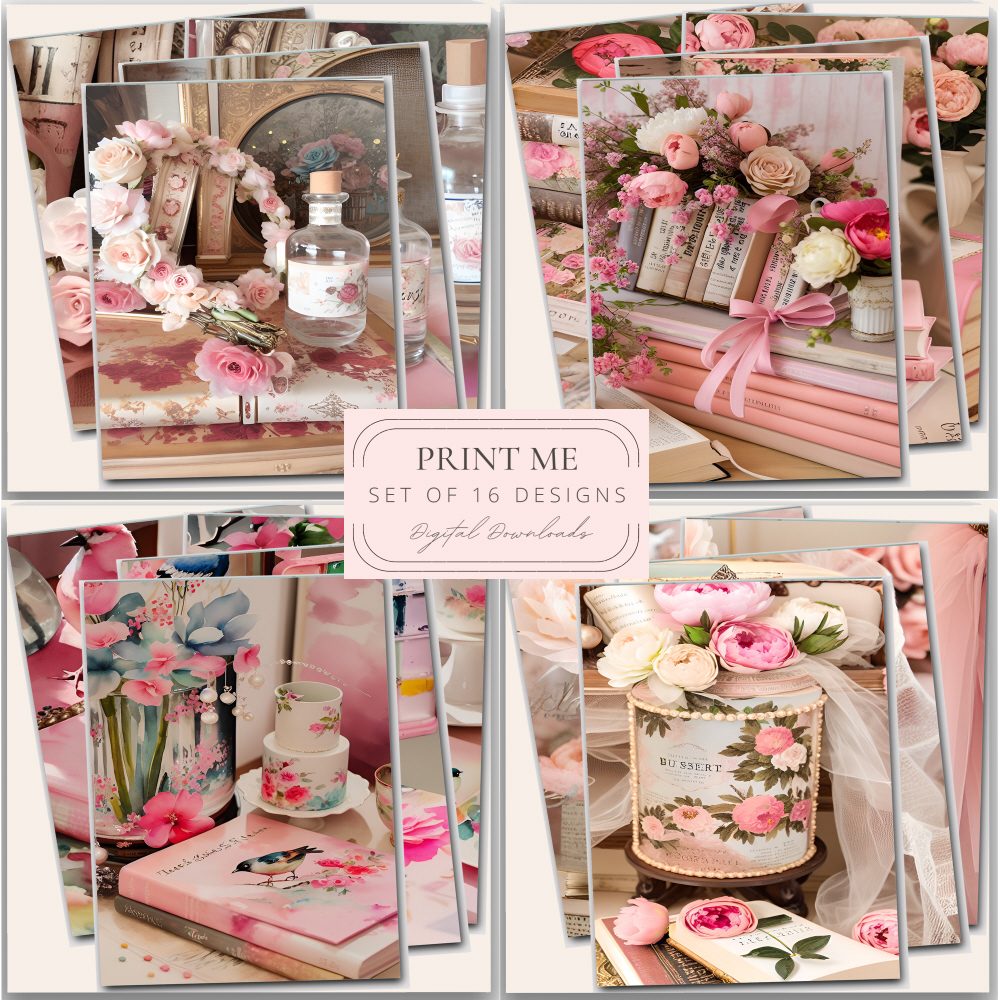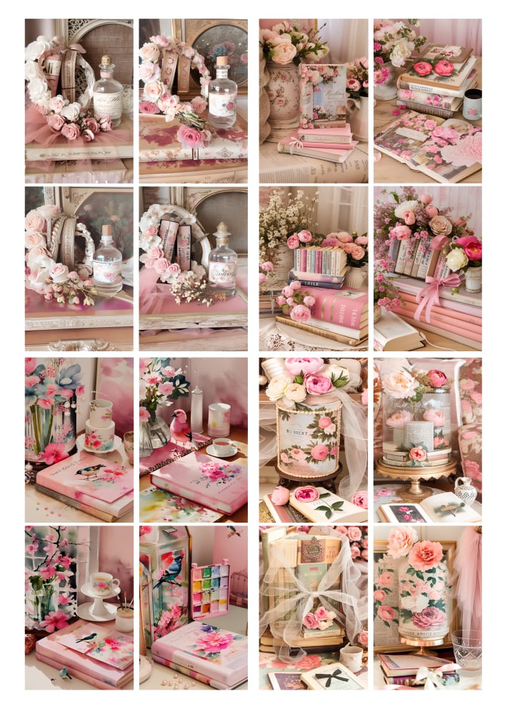 A pretty collection of vintage birds illustration, roses peonies, vintage books and pink shabby layouts digital downloads printables.