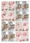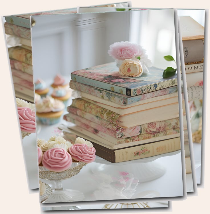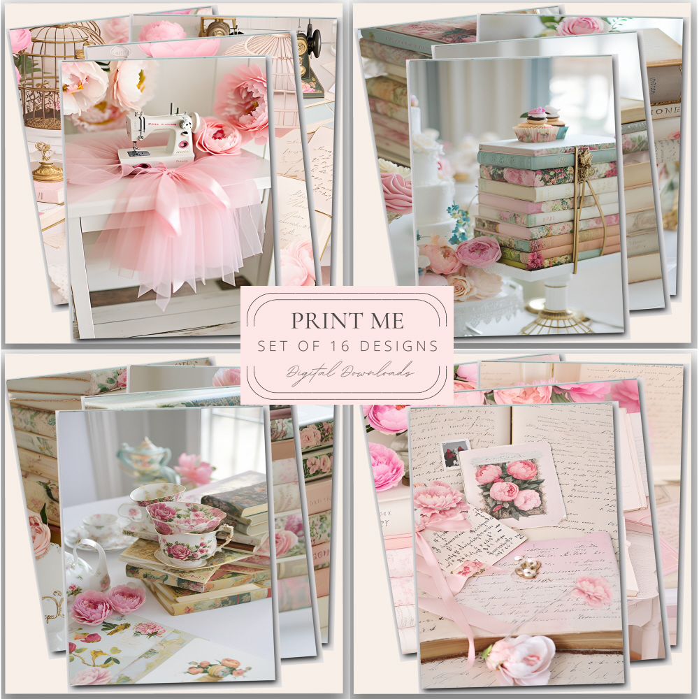 Pastel collection of floral vintage books, old letters, pink peonies, tulle, tea cups, mini cupcakes and sewing machines elements digital downloads printable files.