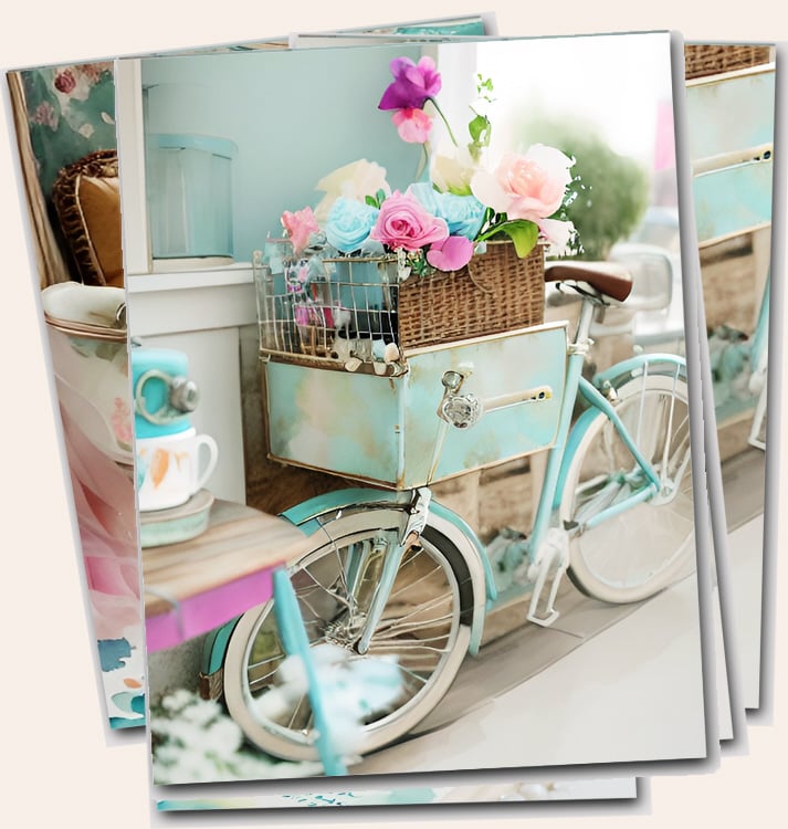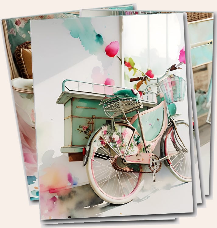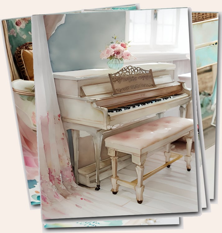 Watercolor shabby collection of sewing machines, Pianos, macaroons, books and vintage bicycles digital download printable files.