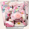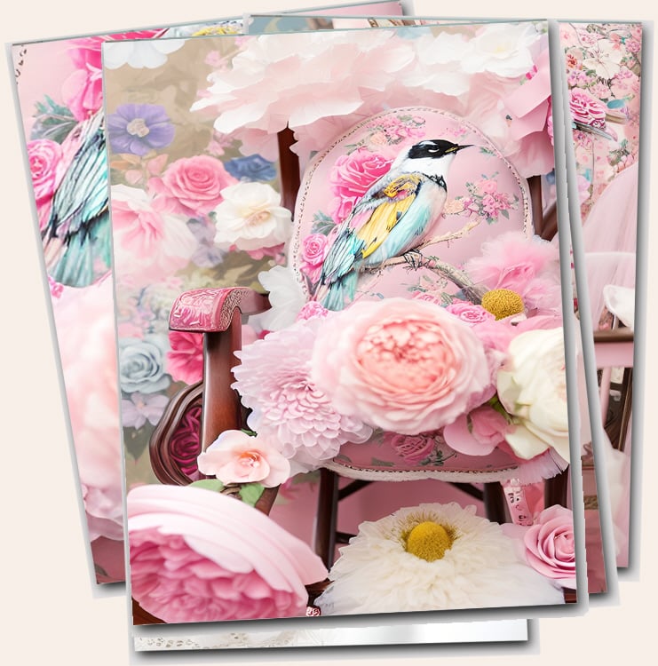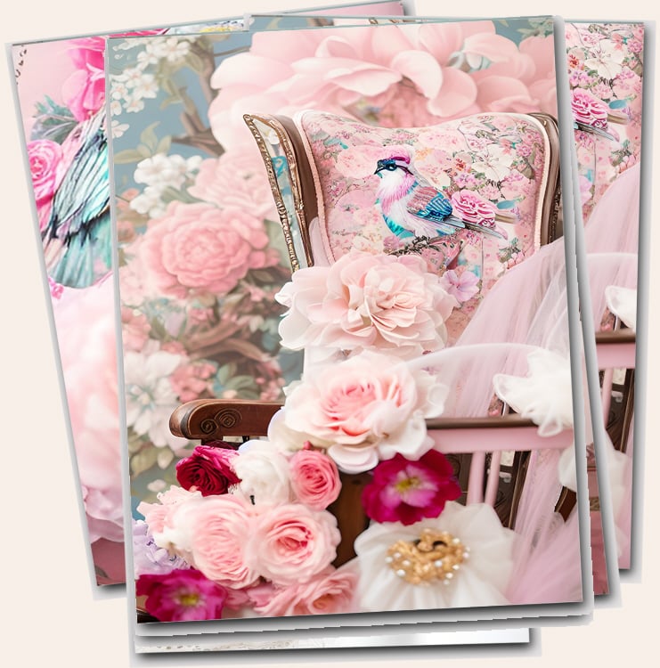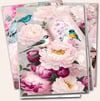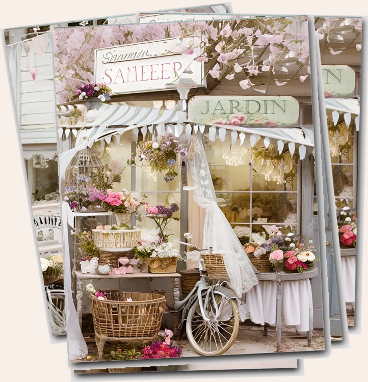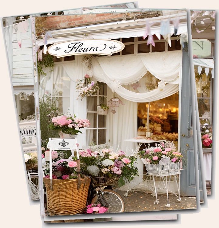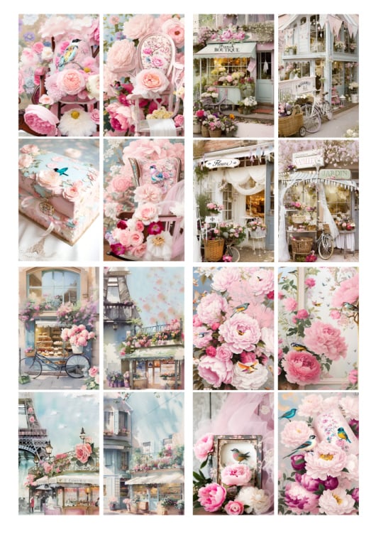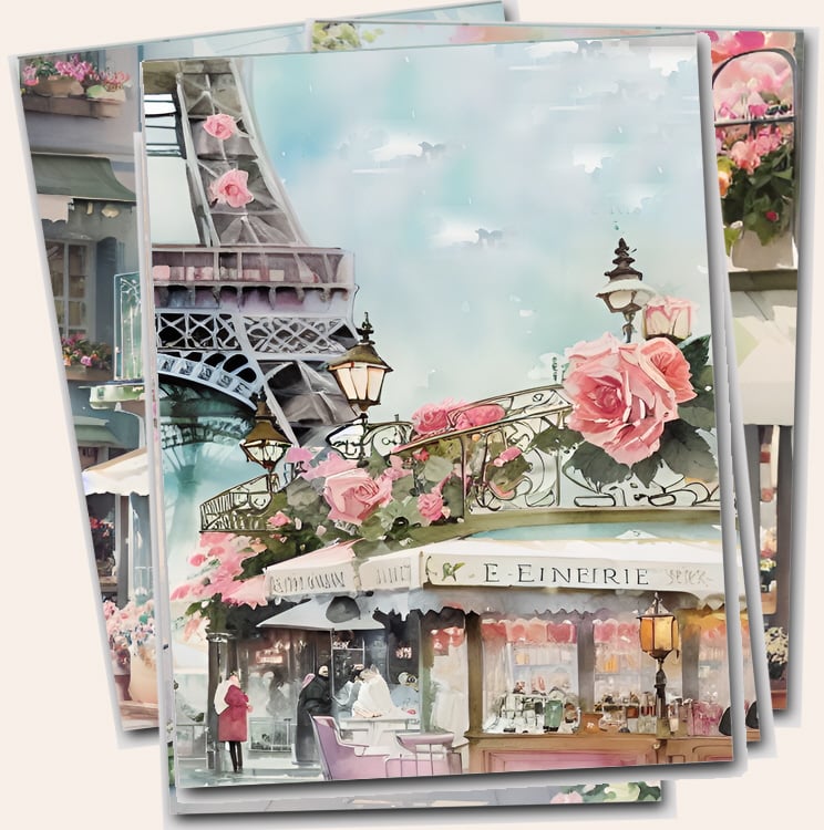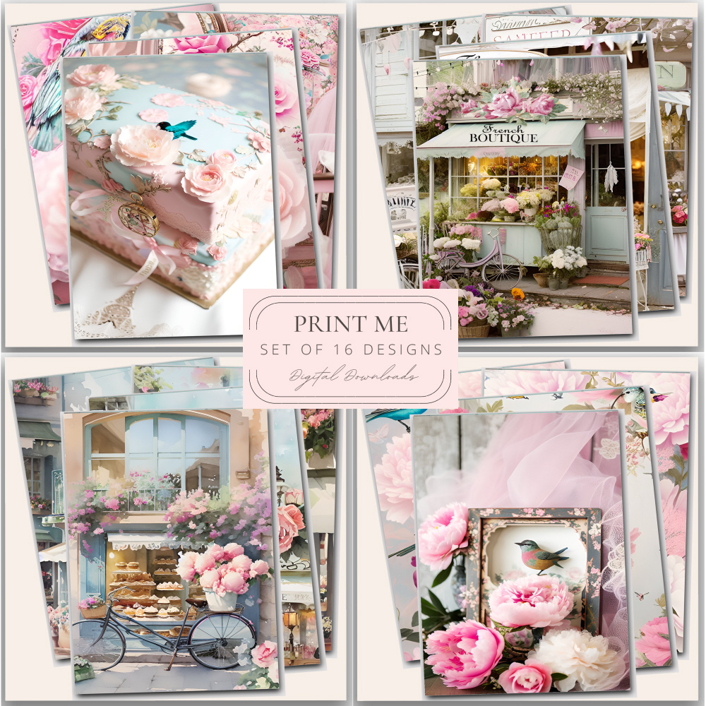 Watercolor illustrations of shabby chic cafes and pink peonies & birds background digital download printable files.